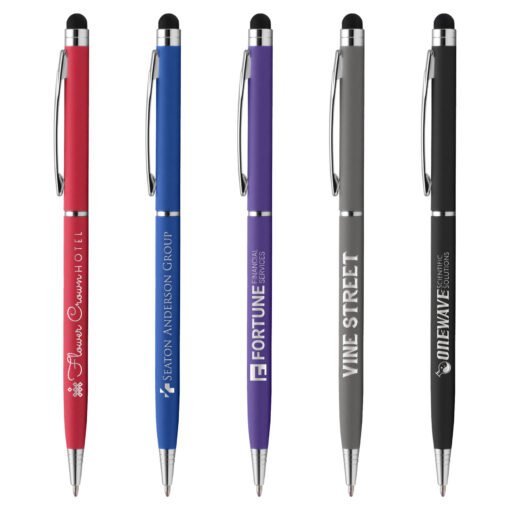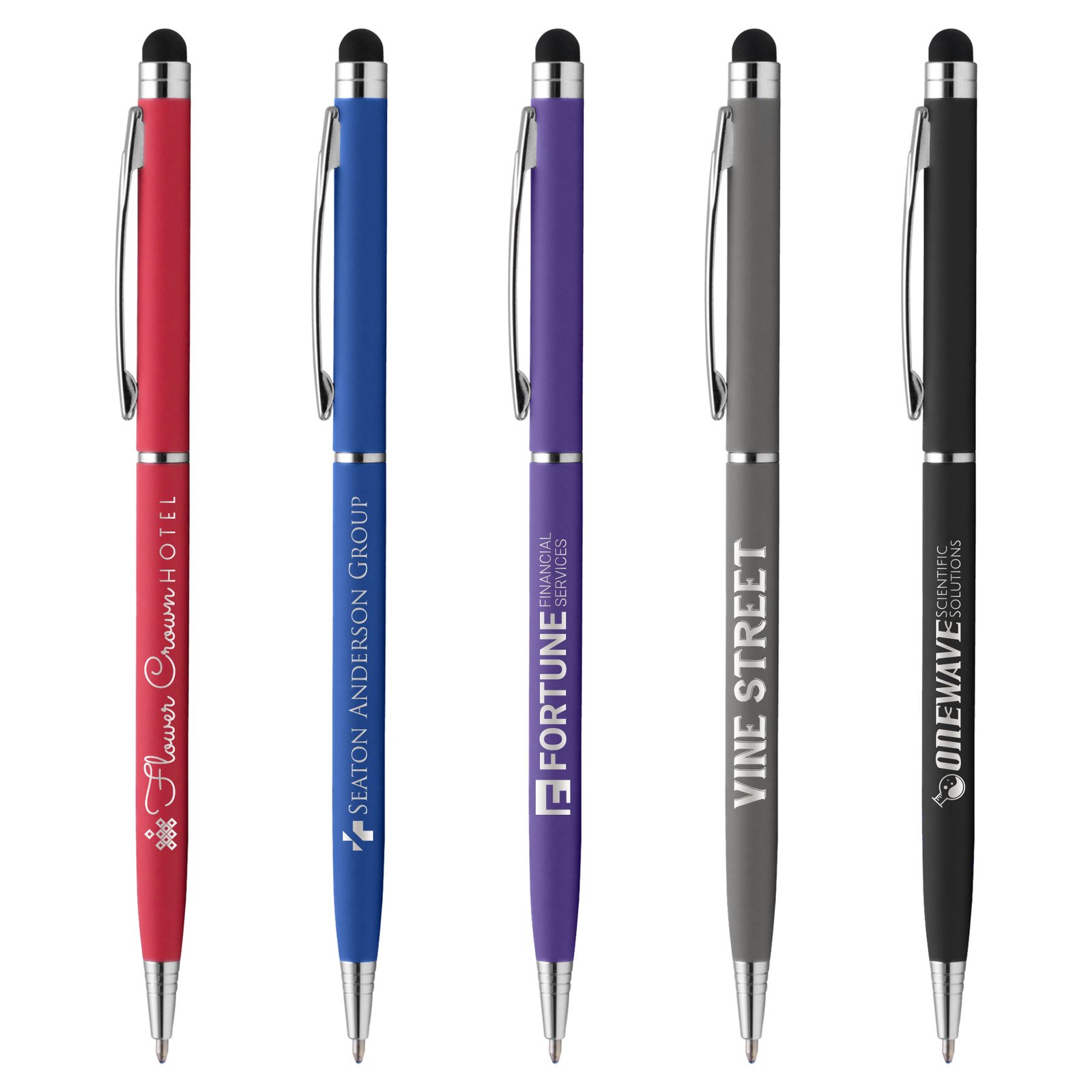 Sleek, soft and ultra slim, this twist-action ballpoint metal pen features the ever-popular rubberized soft-touch finish. Vibrant solid barrel colors, chrome accents and clip, the Minnelli Softy includes a stylus for use on touchscreen devices. Customize with an impressive laser engraving.